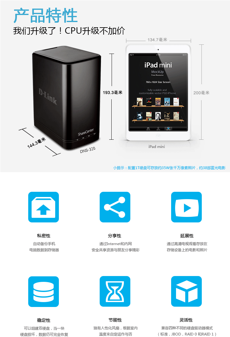 | 型号 | DNS-320 | | 颜色 | 黑 | | 外壳材质 | 铝合金 | 功能 | [tr][/tr]